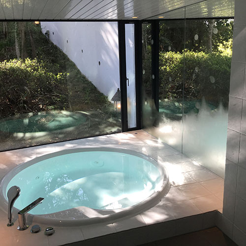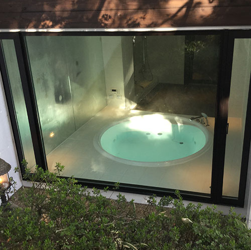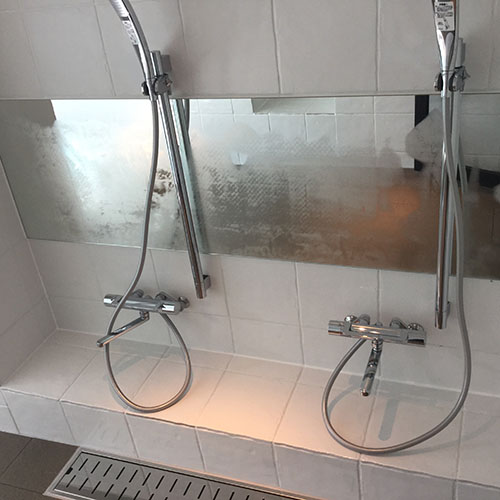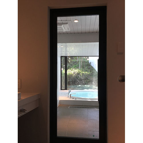 次に浴室の外の風景を一体化させたく、壁面の1面にミラーを取付ました。