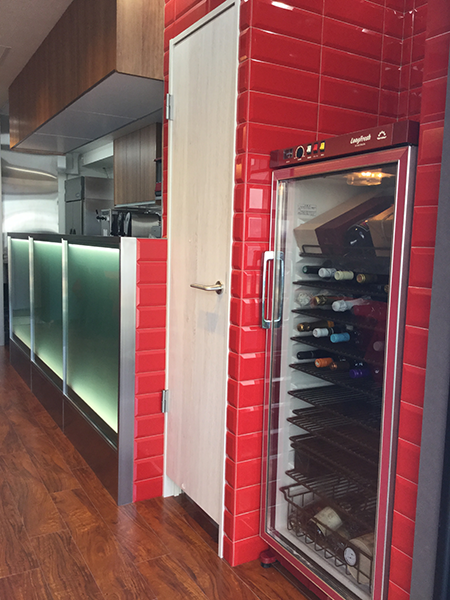 ニッタイ工業の赤いスペイン製タイルを採用しました。シックな店舗のカラーに対して、赤いテーブルクロスと共にアクセントカラーになっています。