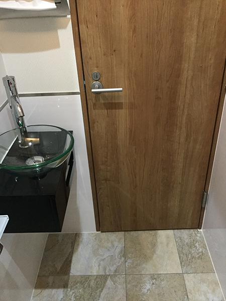壁には客席後部にリクシルのエコカラットと、飾り壁にはクロスではなく、ブルー調のレザーを貼り、豪華さを演出しました。