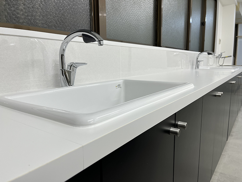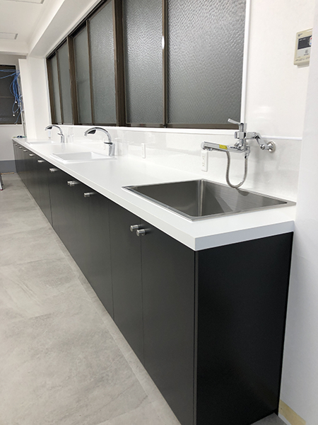 大人数での施工工事でしたが、家具工事などは事前に寸法取り発注までスムーズに行い、綺麗に収まりました。