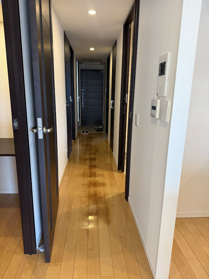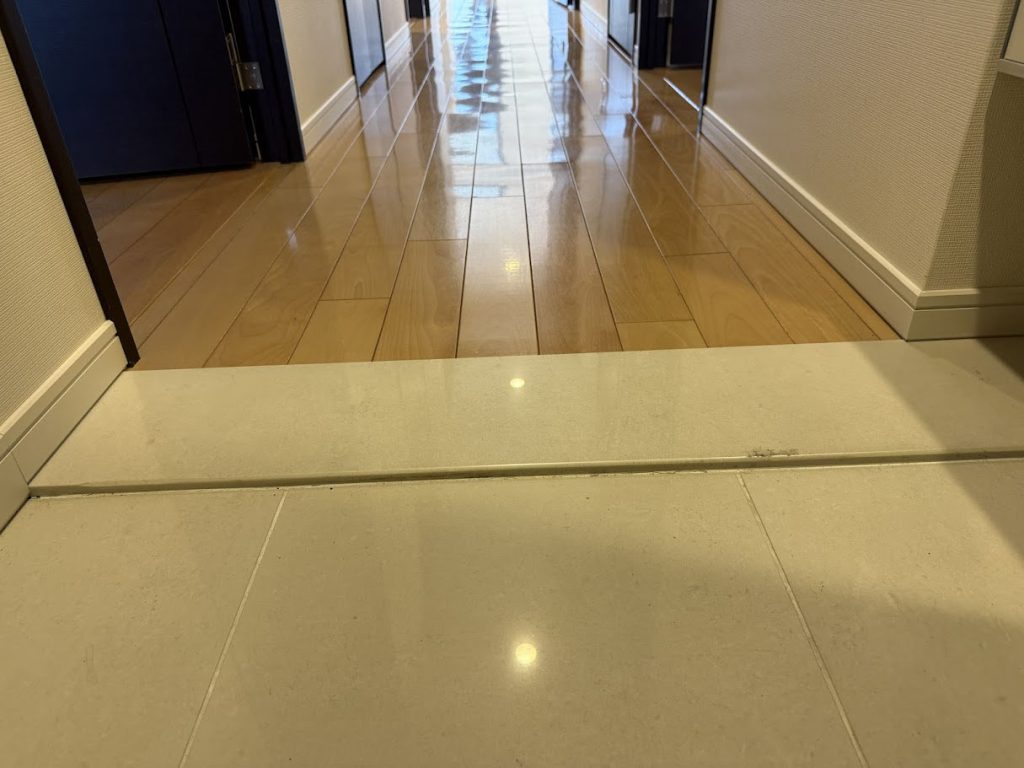 最近のマンションでは玄関土間と室内フロアーの高さがほとんと同じといったケースも多く見られます。今回も2ミリ程度の段差しかなかったので、フローリングを増し張りすることも考えられましたが、