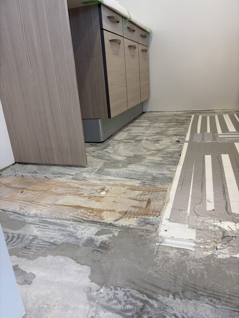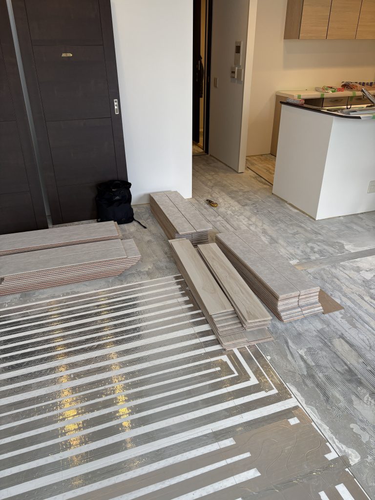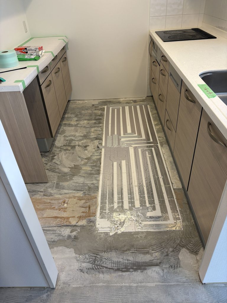 中でもリビングとキッチンに床暖房がありましたので、通常はフローリングを張り替える際、既存のフローリング解体時に床暖房も一緒にはがれてしまう可能性がありますので、床暖房も新規に入れ替える場合が多いのですが、今回は解体してみて、床暖房が傷つかずに使用ができる確認が取れた場合はそのまま生かす方向のお話の中で工事が進みました。