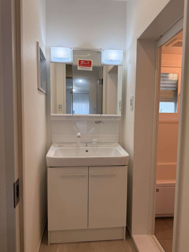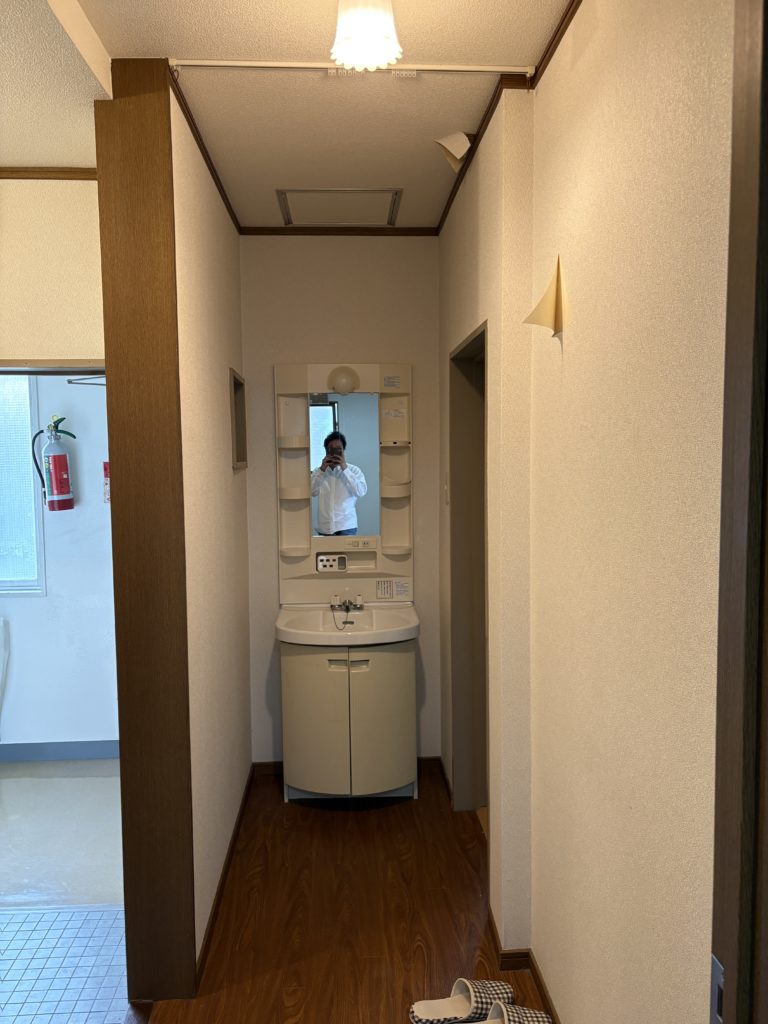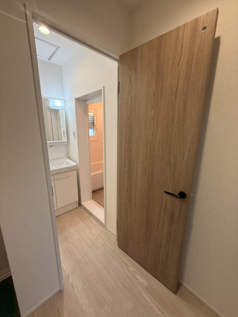 玄関からつながっているカーテンレールで仕切られていた脱衣洗面室に新たに開き戸を設置。プライバシーが確保された脱衣洗面室になりました。洗面化粧台はLIXILのオフトを採用大型洗面器はつけ置き洗いにも便利な仕様になっています。