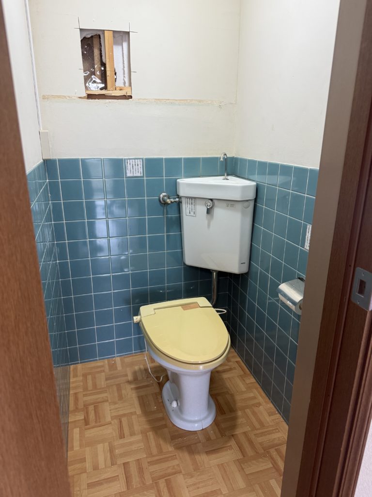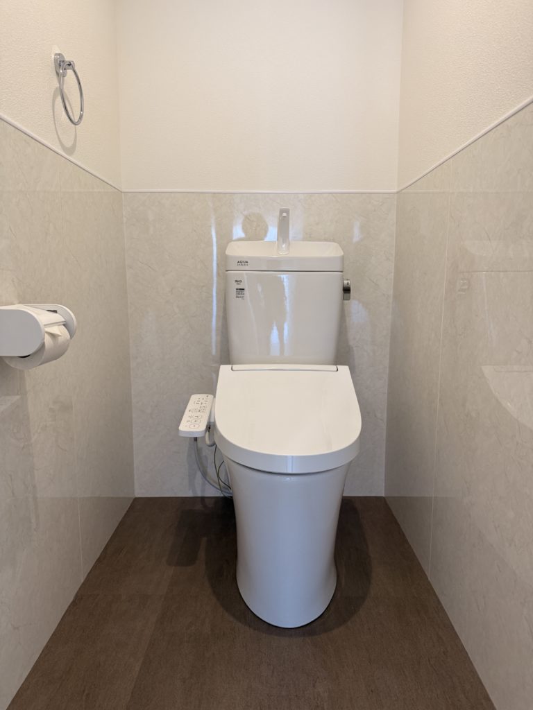 もともとトイレの部屋の奥行が狭くコーナータンク式の便器を使っていましたが、部屋の奥行を広げて水栓の位置も移設してすっきりしました。今回壁にはサニタリーパネルを採用してメンテナンス性もよく、高級感もある内装になりました。リビング側から見て扉の面材もそろえて、落ち着いたデザインにしあがっています。