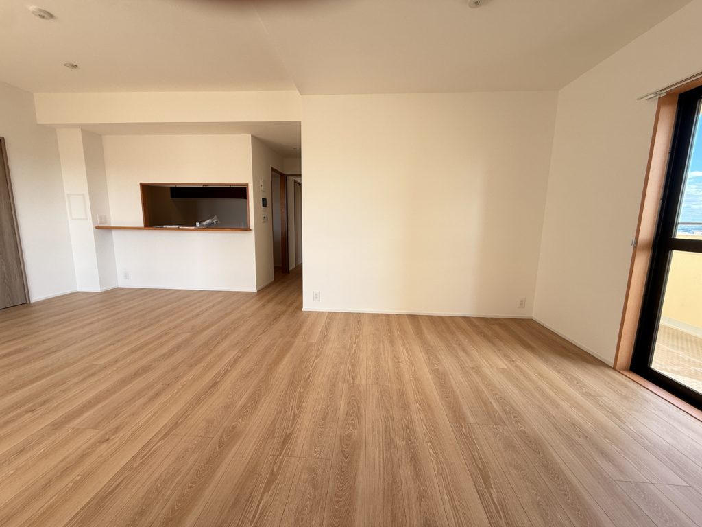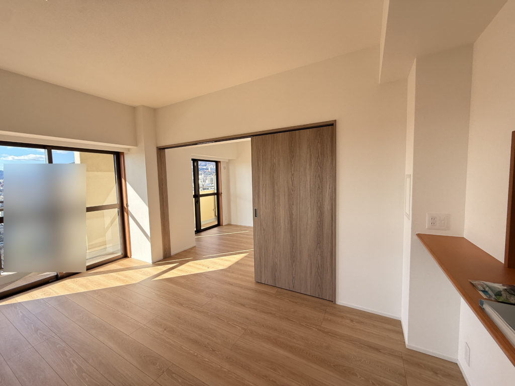 独立していた和室はリビングと一体化し、広がりのあるLDKへと再構成しました。間仕切りをなくすことで視線が奥まで抜け、タワーマンションならではの眺望や採光をより感じられる空間に。床や内装の素材を統一することで、もともと和室だったことを感じさせない、自然で伸びやかなリビングが完成しています。
