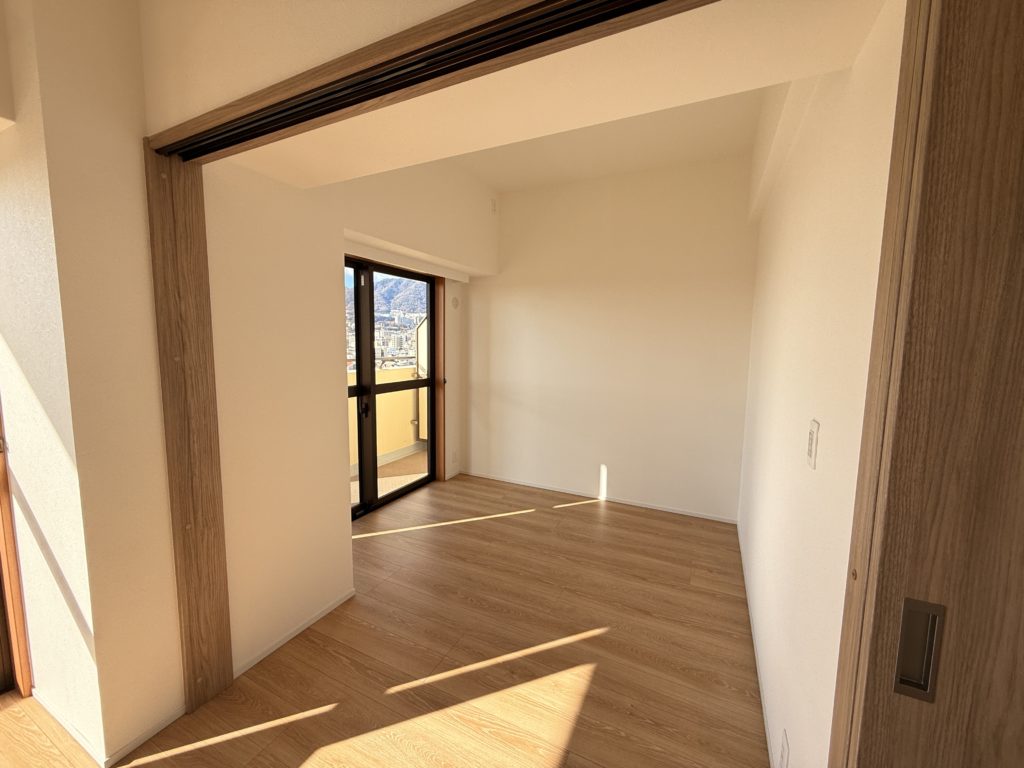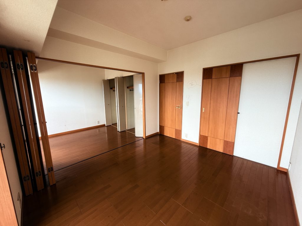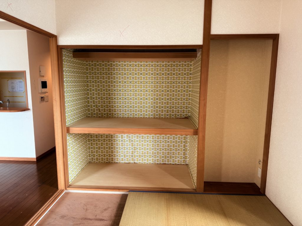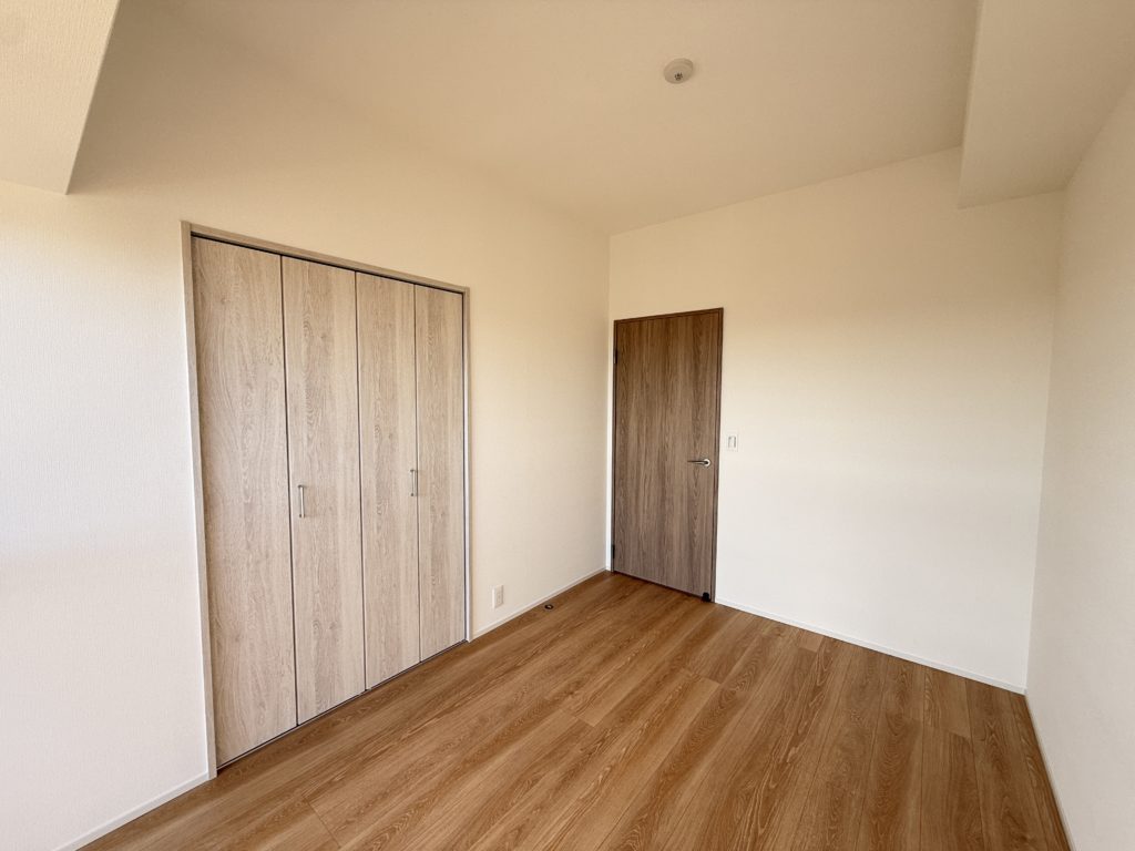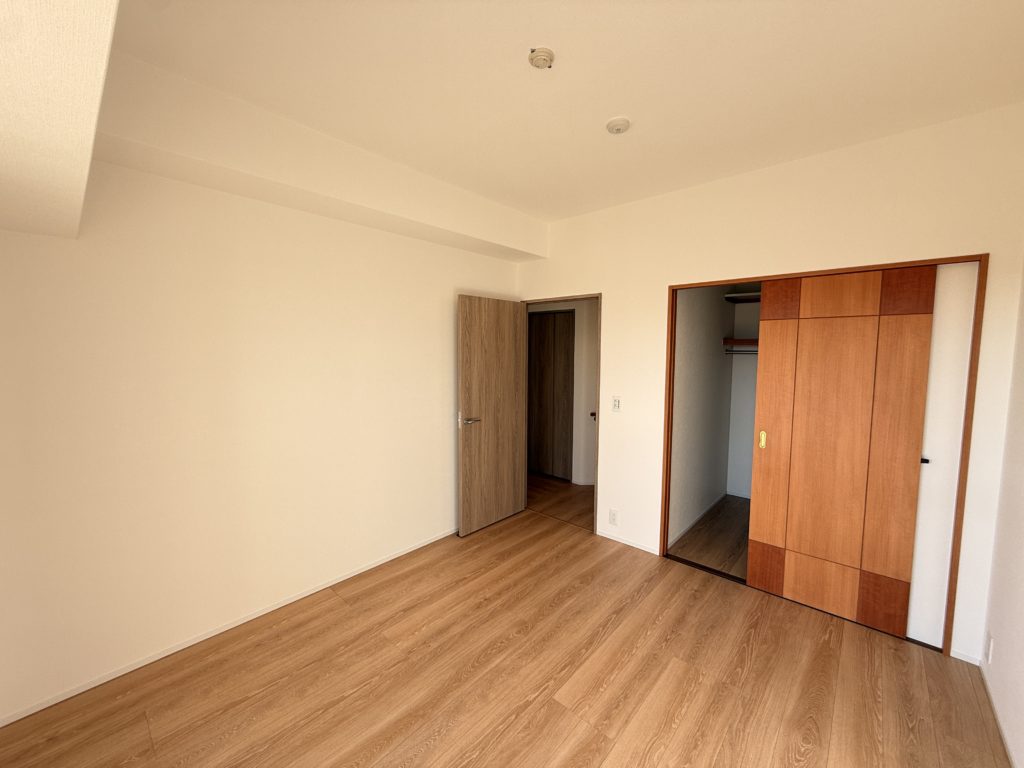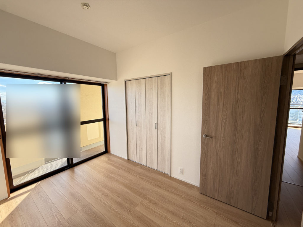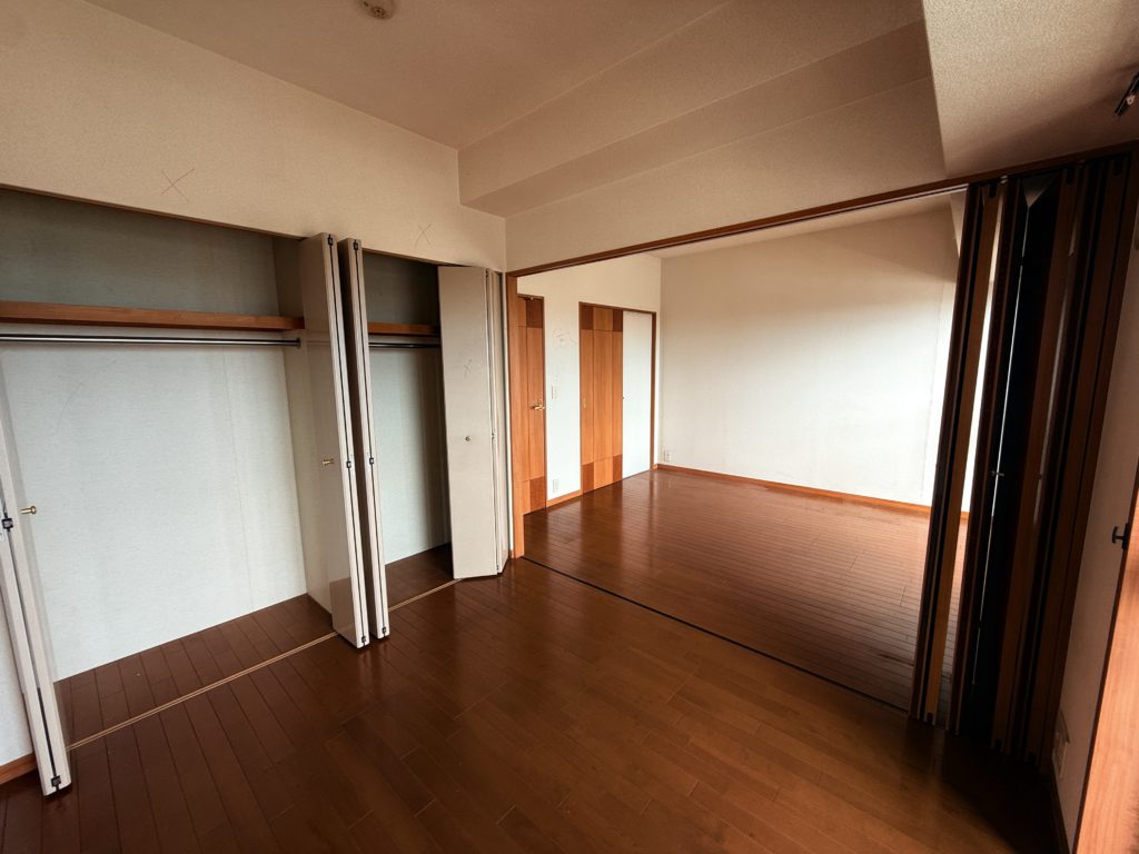 収納計画では、和室の収納と隣接する個室の収納を活かしながら、洋室側へと再構成しました。課題となったのは、大きな梁の下に配置されていた洋室のドアです。視覚的な圧迫感を軽減するため、この部分を新たな収納スペースとして取り込み、入口位置をずらすことで、梁の存在感を抑えた設計としました。収納量を確保しながら、すっきりとした印象の空間に仕上げています。